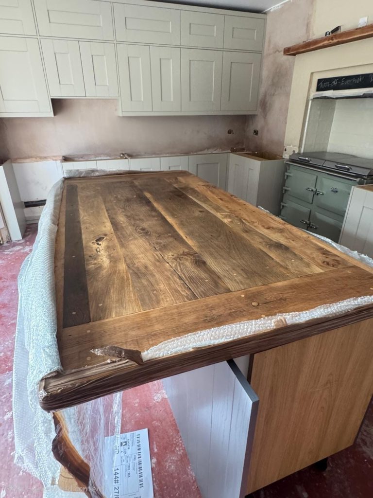 Reclaimed oak custom-made kitchen island ready to be unpacked.